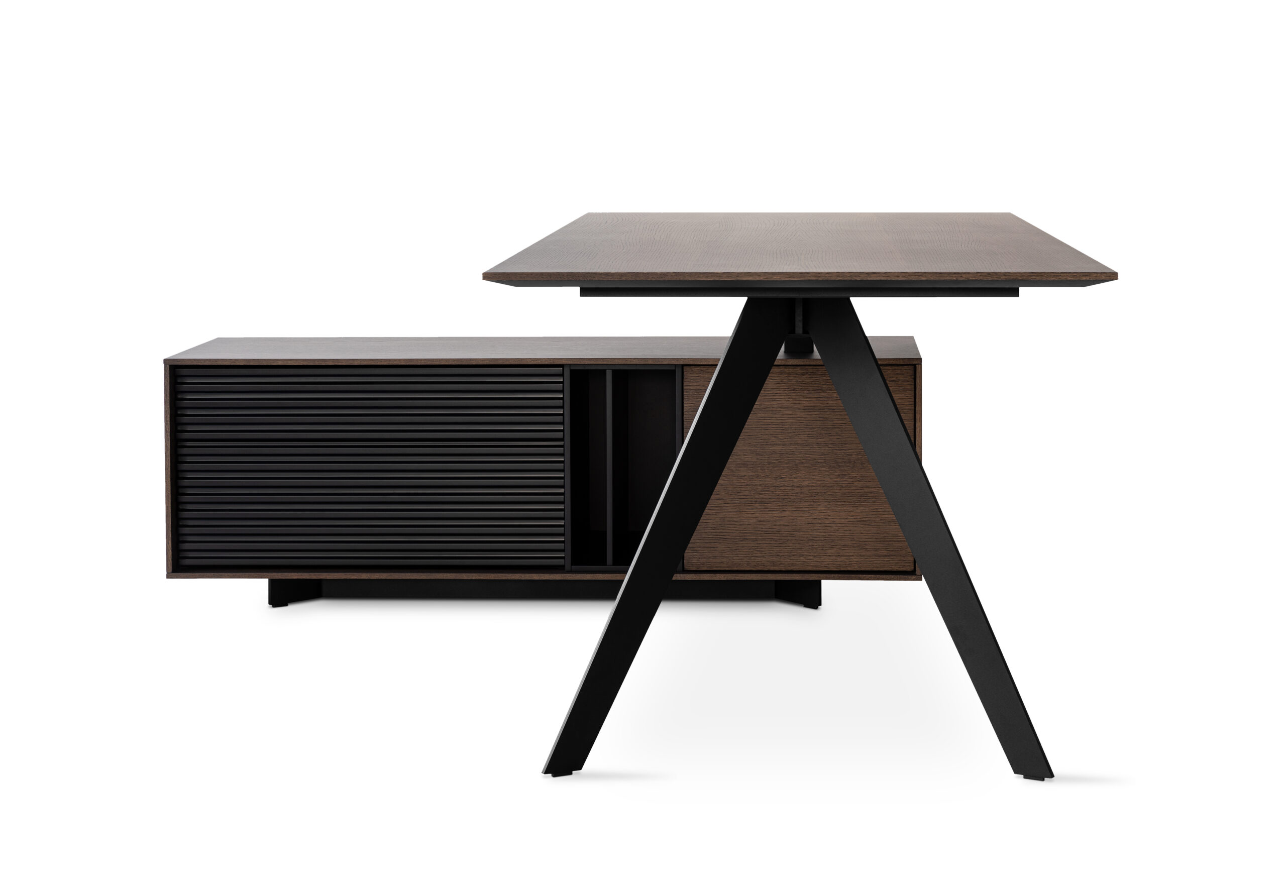 Desks are available in two variants, free-standing and supported on a cabinet.
