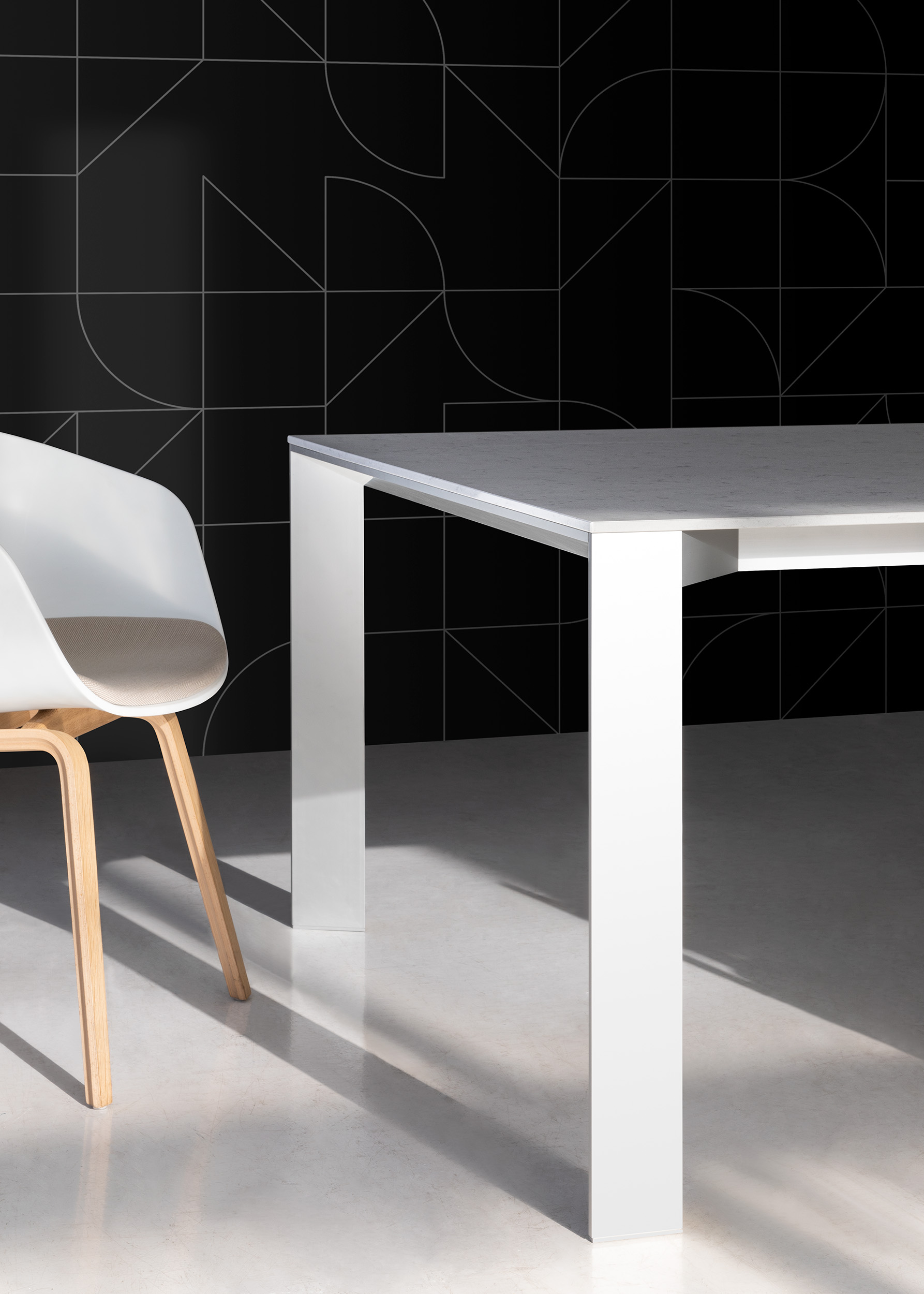 In tables are the quintessence of modern elegance. The interesting shape of the legs and frames made of noble anodized aluminum emphasize the prestige of the interior in which they are located. The table tops are thin, visually light, and at the same time durable. The trapezoidal leg profile makes the appearance of In tables change depending on the adopted perspective.