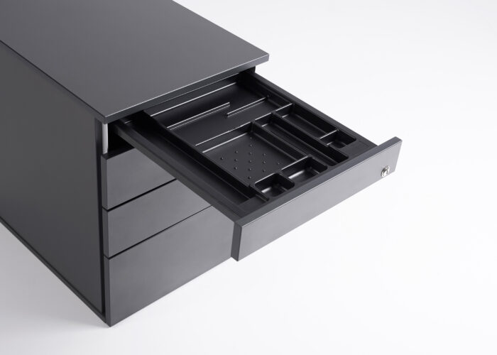 K2 under-desk containers are minimalist in form and convenient to use. The drawers are opened using a special handle on the side, and for those who prefer traditional solutions, there is an option to mount handles. Under-desk containers are available in depths of 60 and 80 cm, allowing them to be adapted to different types of desks. Under-desk containers can have high wheels mounted, recessed into the lower ring or feet. Narrow containers – 33 cm wide, are ideal for smaller offices where space savings are paramount. Drawers can be equipped with metal or plastic inserts, depending on needs. All drawers are equipped with self-closing, central lock and an additional drawer with a pen holder (in most containers) as standard. An additional option is a soft close, increasing comfort in the office.