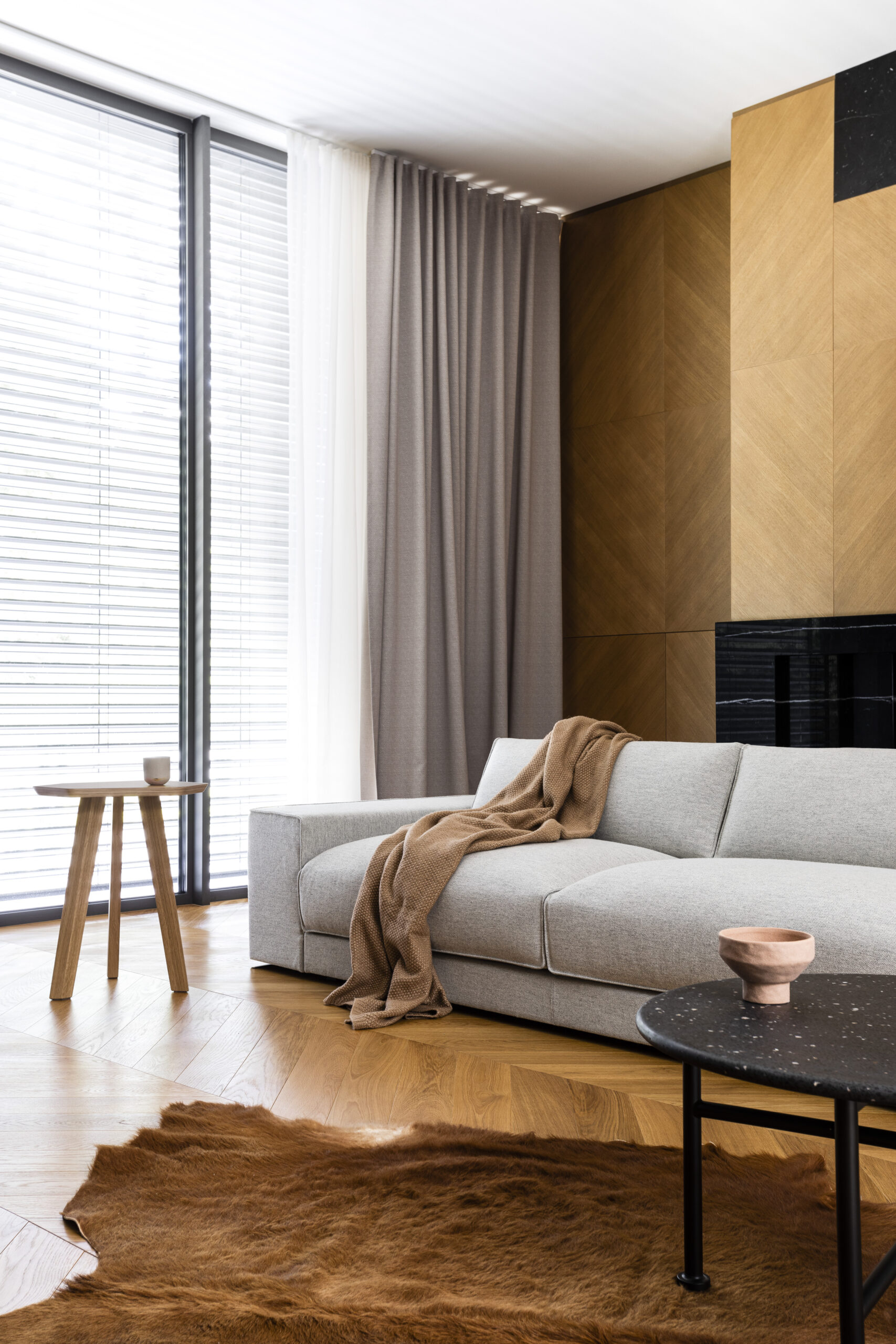 The main structure of the furniture is made of wooden components. The cuboid shape of all soft elements is additionally enhanced by distinctive stitching on the edges.
