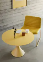 Leo table with metal base and round top available in different finishes such as glass, HPL, veneer, ceramic, and marble. Available top sizes D:100, D120, D150