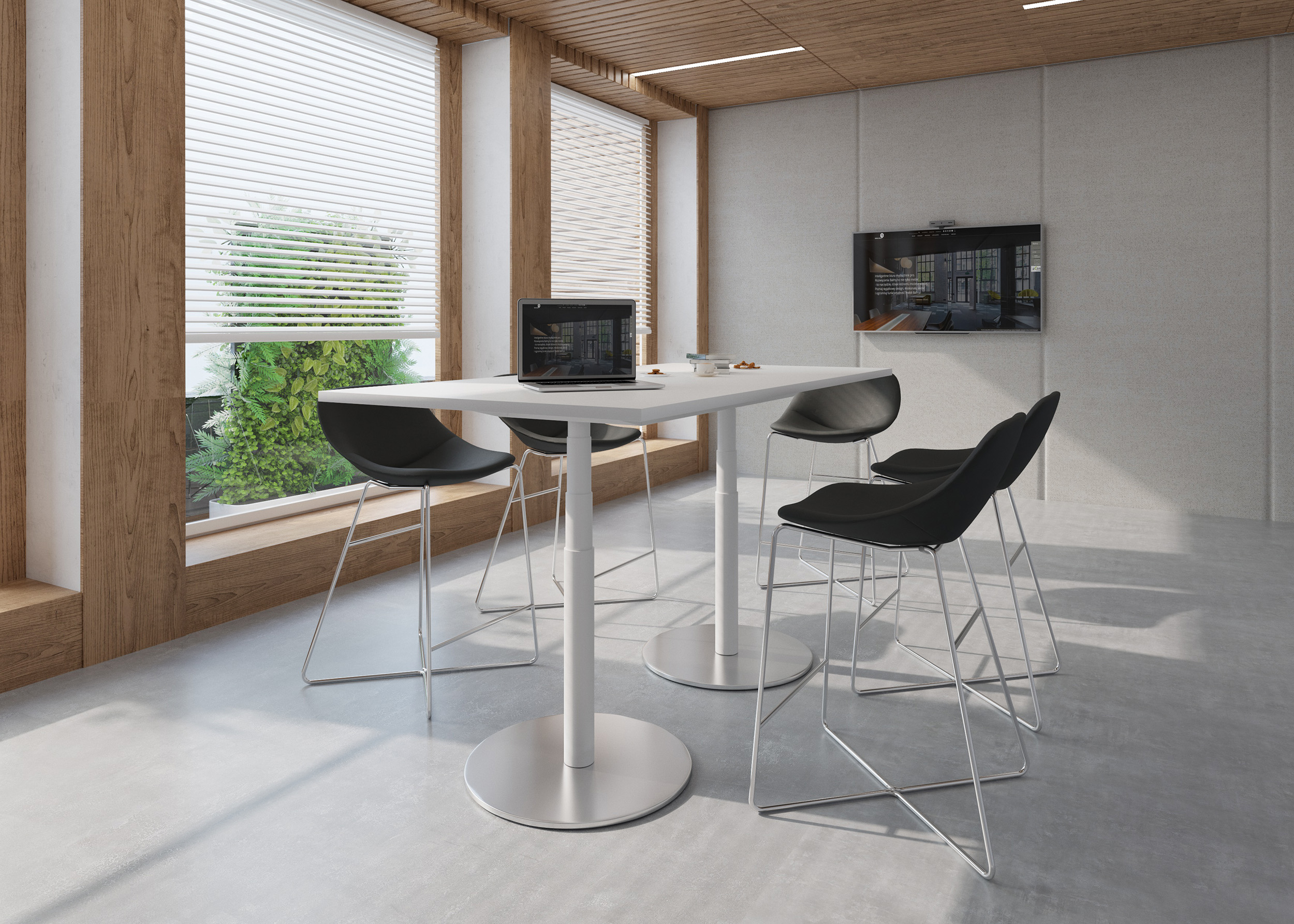 Height-adjustable Plus tables are a proposal dedicated to spontaneous meetings in the office. Changing body position during work not only supports the musculoskeletal system, but can also stimulate creativity and efficiency. The Plus table with electric height adjustment supports the dynamics of work. Depending on the nature of the meeting and the preferences of the participants, one can choose to work standing or sitting. Thanks to the large top with a width of 180 or 200 cm, several people can work comfortably at the table.