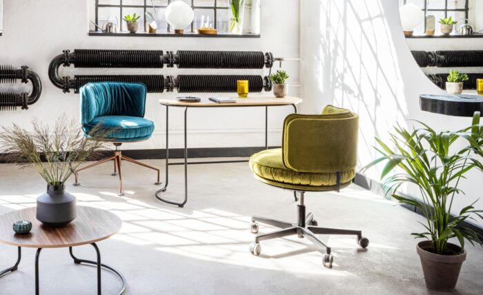 VANK_RING is a family of comfortable lounge chairs, office chairs, sofas, barstools, and poufs, which will make a great addition to minimalist, boho, and vintage style office environments. RING will be an excellent choice for common spaces in the office, reception areas, foyers, and cafés. The trademark of the series is its bold, theatrical lines, a modernist base resting on a circular form, and a distinct creasing of the fabric. The solution has been created with sustainability in mind: its design makes it possible for its components to be recycled after use and its seat contains industrial polyurethane foam waste. The collection includes also coffee tables and high tables for meeting areas and a desk for home office use.