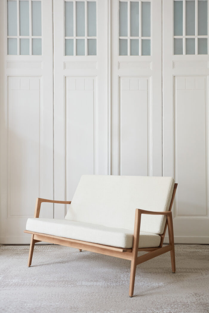 a modernist form and a simple design, enriched by gently contoured armrests, reminiscent of classics of Danish design.