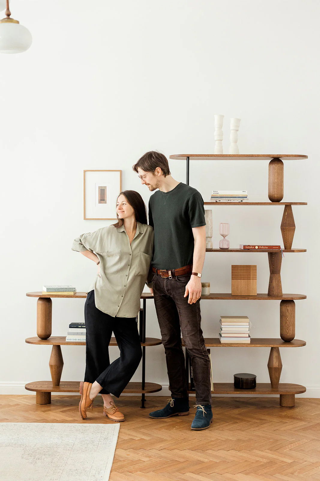 VAZOO is a modular shelving system built around distinctive, lathe-turned forms reminiscent of vases. These sculptural elements support the shelves while adding a bold visual accent to the overall design.